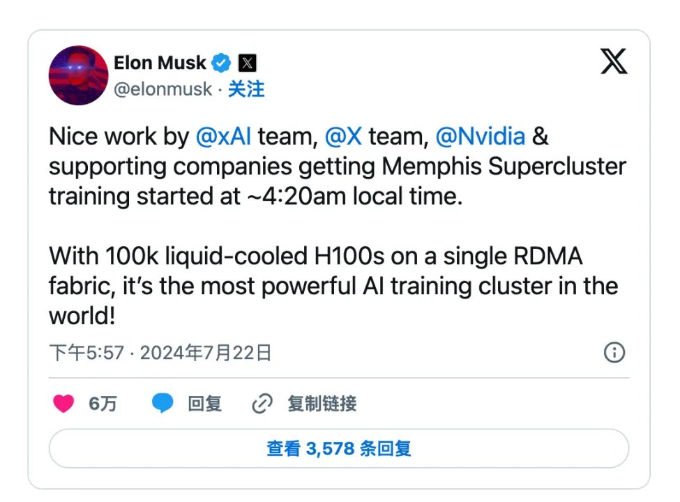(馬斯克此前在X上宣布啟用10萬卡規(guī)模的孟菲斯超級集群)