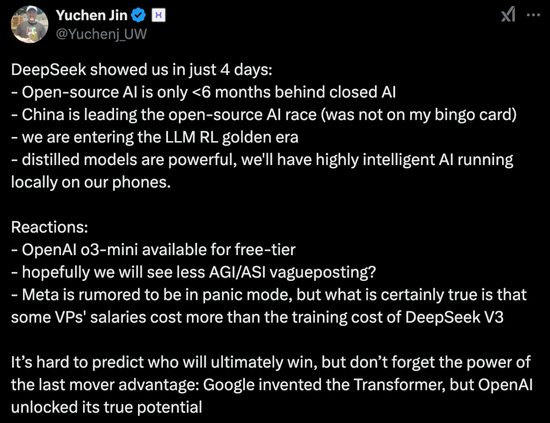 Hyperbolic 的 CTO、聯合創始人 Yuchen Jin 發帖表示,在僅 4 天時間里,DeepSeek-R1 向我們證明了 4 個事實: