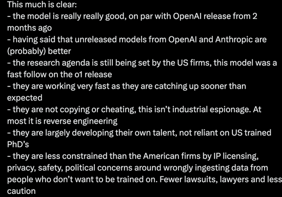 從目前來看,研究方向仍主要由美國公司主導,DeepSeek 模型屬于對 o1 版本的‘快速跟進’,但 DeepSeek 的研發進度非常迅猛,比預期更快地迎頭趕上,他們并沒有抄襲或作弊,最多只是逆向工程。