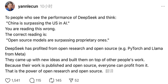 LeCun 表示,DeepSeek 之所以這次一鳴驚人,是因為他們從開放研究和開源(如 Meta 的 PyTorch 和 Llama)中獲益。DeepSeek 提出了新想法,并在他人工作的基礎上構建。因為他們的工作是公開發布和開源的,每個人都可以從中受益,這就是開放研究和開源的力量。
