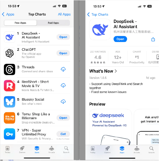 毫不夸張地說,DeepSeek在美國AI行業引發了一場地震,更引發了媒體的爭相報道。幾乎所有的主流媒體和科技媒體,都報道了中國AI模型超過美國這一爆炸新聞。短短幾天時間,DeepSeek就已經成為蘋果應用商店排名第一的免費應用,力壓OpenAI的ChatGPT。