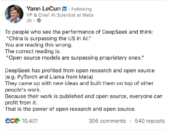 LeCun,法國人)則強調中國人是依靠開源的優勢取得成功。他在對DeepSeek的成功表示贊賞的同時強調,DeepSeek的成功并非意味著中國在AI領域超越美國,而是證明了開源模型正在超越閉源系統。
