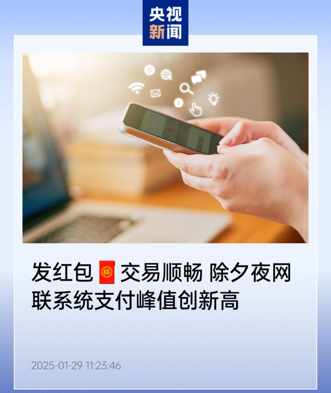 1 月 29 日消息,據央視新聞報道,今年除夕夜,網聯清算公司和中國銀聯處理的全行業網絡支付峰值為每秒 10.9 萬筆,較去年增長 4.61%,創歷史新高。