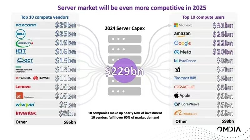 從資金走向看,Omdia表示,2024年服務(wù)器投資出現(xiàn)了高度集中化的情況。服務(wù)器客戶用于服務(wù)器的資本開支2290億美元,支出最多的是云廠商微軟、亞馬遜、谷歌和Meta,服務(wù)器廠商中,富士康、戴爾和超微電腦銷售額則排名前三,其中富士康銷售額290億美元,超過戴爾的250億美元。