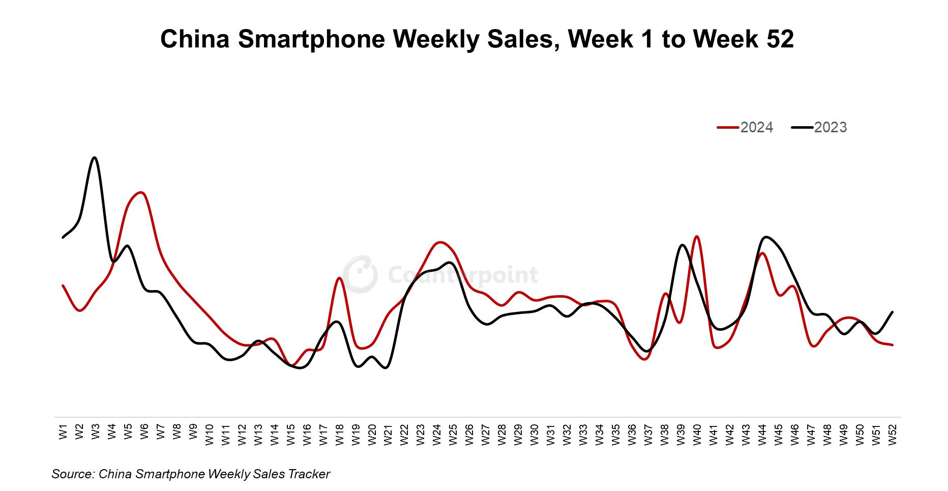 根據(jù) Counterpoint 的中國智能手機(jī)周度銷量追蹤數(shù)據(jù),2024 年中國智能手機(jī)銷量同比增長 1.5%。但市場表現(xiàn)并不均衡,年初和年末都相對疲軟,不及上年同期;不過,從第 5 周到第 36 周,銷量普遍好于去年同期。IT之家附上圖片如下:
