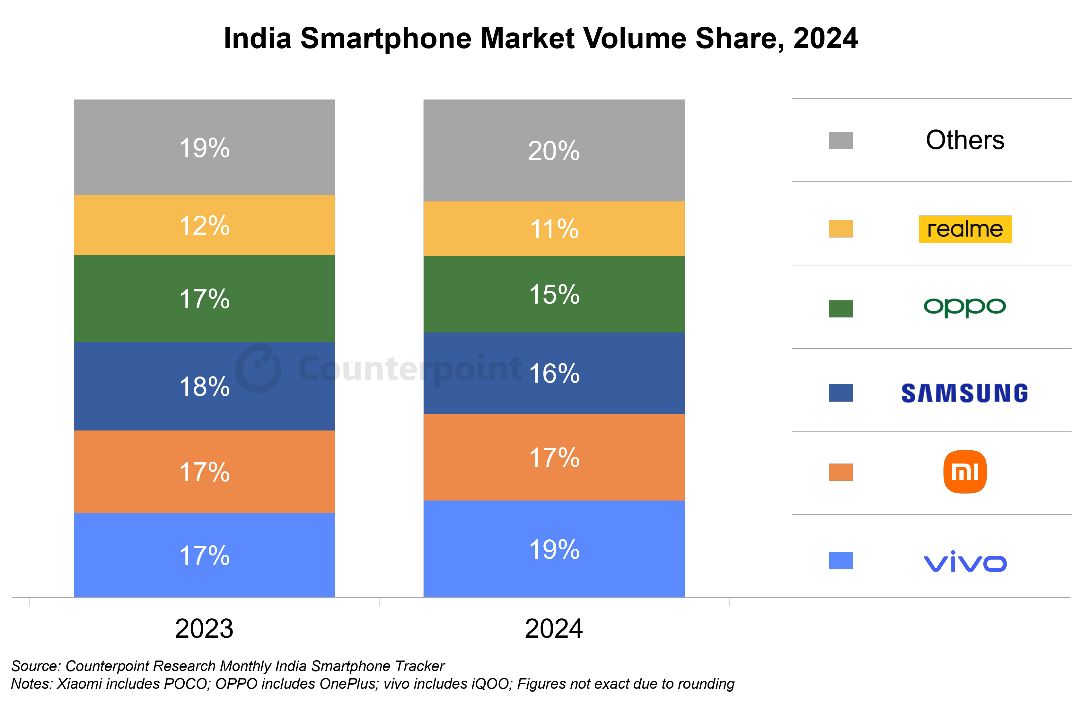 報告稱 2024 年印度智能手機出貨量達到 1.53 億臺,同比增長 1%;但歸功于高端手機的強勁需求以及消費者對高價位手機的偏好,手機出貨額同比增長 9%,創歷史新高。