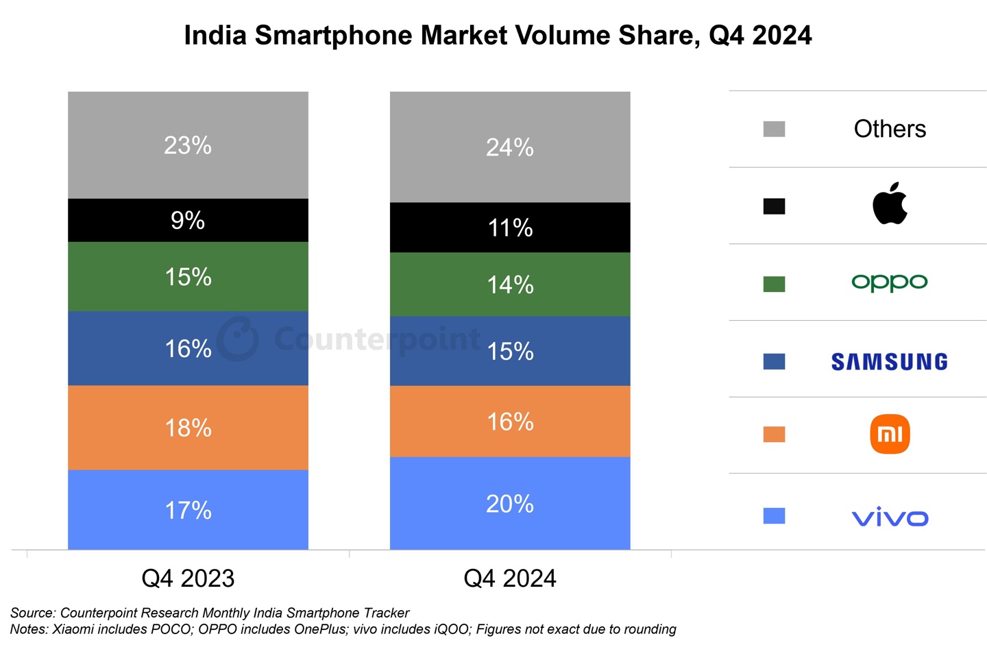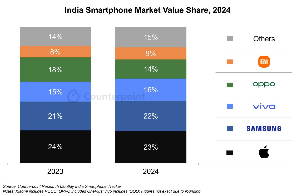 蘋果在 2024 年第四季度躋身前五,單季度出貨量創歷史新高,并以最高的市場價值份額結束了這一年。