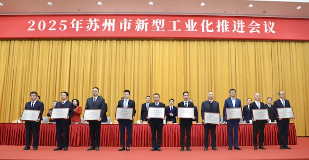 會議當天,11個重要投資項目簽約,總投資達796億元的166個億元以上的產業項目投產。此外,多個服務平臺揭牌,示范項目啟動,蘇州市推出制造業“1030”產業鏈的關鍵技術攻關清單及相關企業培育名單,發布支持新型工業化的資金、信貸和保險產品,并推出多個人工智能工業大模型。市委市政府主要領導為我市獲得國家級、省級榮譽的企業、企業家代表頒獎授牌。通鼎集團被授予“蘇州市制造業十強企業”榮譽稱號。