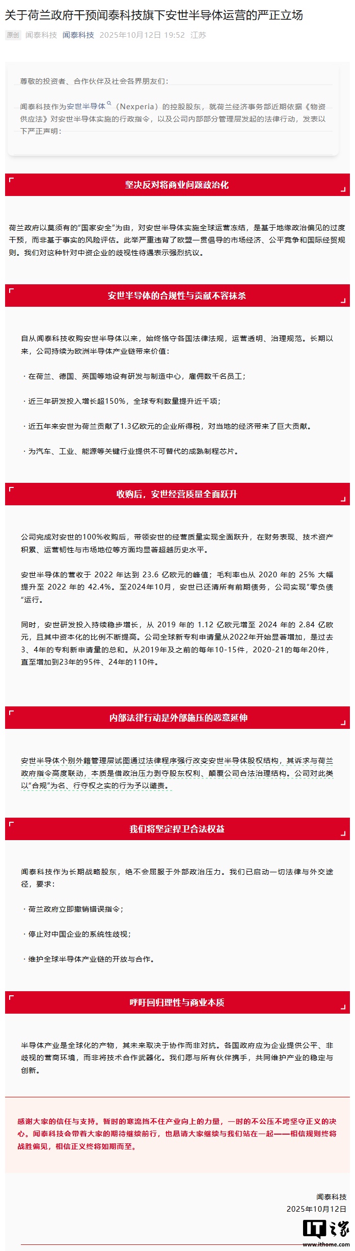 聞泰科技 10 月 12 日晚發表聲明,譴責荷蘭政府以“國家安全”為由凍結安世半導體全球運營,稱此舉違背市場經濟原則。安世半導體個別外籍管理層試圖通過法律程序改變股權結構,聞泰科技認為這是借政治壓力剝奪股東權利。公司表示將捍衛合法權益,呼吁回歸商業本質。