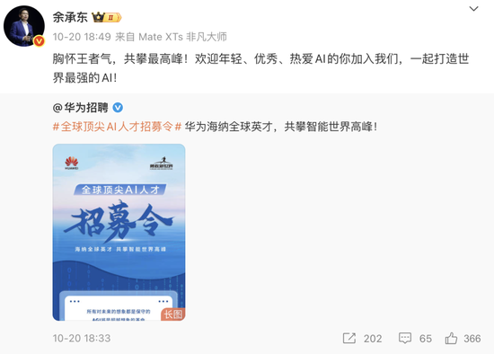 10月20日,華為招聘官微發布“全球頂尖AI人才招募令”,稱正在打造世界一流的AI戰隊,構建領先世界的大模型,攀登AGI的巔峰。余承東也在微博轉發該招募令,并表示:“胸懷王者氣,共攀最高峰!歡迎年輕、優秀、熱愛AI的你加入我們,一起打造世界最強的AI!”