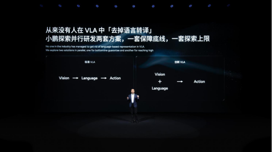 如果說物理 AI 是未來出行的 “操作系統”,那第二代 VLA 就是這套系統的 “核心引擎”。在發布會現場,技術團隊用一個對比圖直觀展示了它的顛覆:傳統智駕需要經過 “視覺識別 - 語言轉譯 - 動作指令” 三步(V-L-A 架構),而小鵬第二代 VLA 直接砍掉 “語言轉譯” 環節,實現 “視覺信號到動作指令” 的端到端生成 —— 這意味著智駕系統能像人類司機一樣,“看到即反應”,無需中間 “翻譯” 過程。