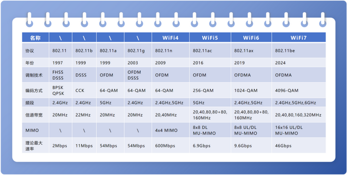 WiFi7 即 IEEE802.11be,EHT (Extremely High Throughput,極高吞吐量)是它的關鍵字,本文將用通俗語言講清楚WiFi速率計算公式并給出WiFi7的理論峰值計算過程。
