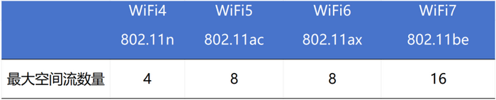空間流可以理解為設備的天線,一條空間流對應一根天線,空間流越多,則天線越多,整機吞吐量也越大。根據以下數據得到WiFi7空間流數最大16條。