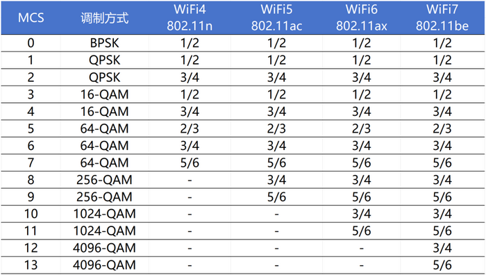 指調制子載波的方式。由于一個子載波承載一個Symbol,編碼方式代表著一個Symbol能承載的bit數量,常見編碼方式有BPSK、QPSK、QAM。根據以下數據得到WiFi7編碼方式目前最大12bit/Symbol。