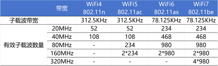 子載波是用于數據傳輸的頻域信號,是頻域資源的一部分,不同調制方式及不同頻寬下的子載波數量不一樣,和帶寬以及每個子載波的帶寬相關。根據以下數據得到WiFi7有效子載波數量最大3920(4*980)。