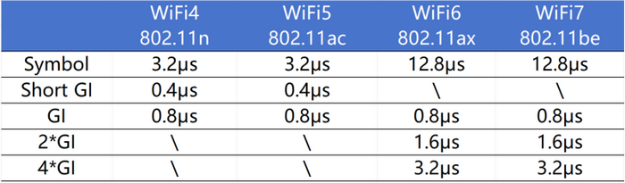符號時間是Symbol時間與GI時間相加的和。Symbol表示一次傳輸的數據,是時域上的傳輸信號;GI是相鄰的兩個Symbol之間的時間空隙,以避免 Symbol 之間相互干擾。根據以下數據得到WiFi7最小符號時間是13.6us(12.8us+0.8us),也即0.0000136s。