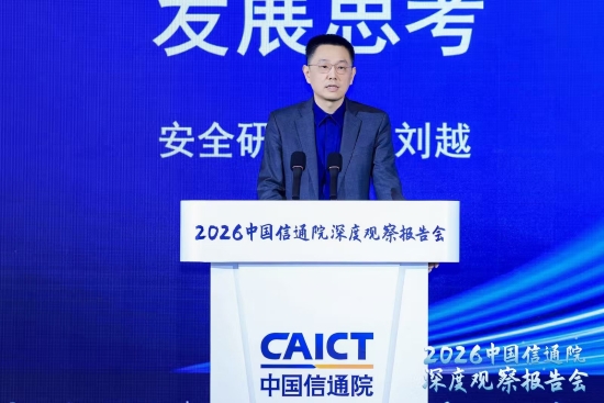 飛象網訊 12月13日,在“2026中國信通院深度觀察報告會”上,中國信息通信研究院安全研究所副所長劉越表示:“當前,世界百年變局加速演進,AI技術為代表的新一代科技革命與產業變革加速突破,大國博弈更加復雜激烈,網絡安全產業面臨新的機遇和挑戰,承擔了更加重要的使命與責任。”