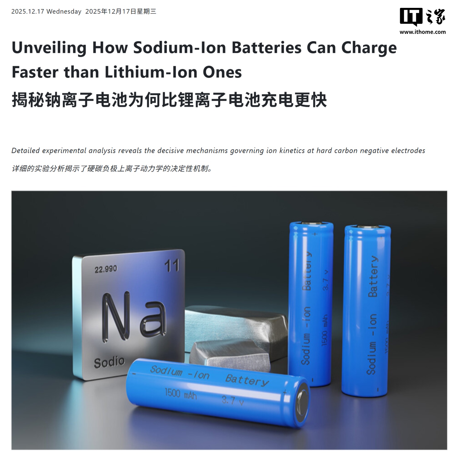 12 月 18 日消息,東京理科大學(TUS)昨日(12 月 17 日)發布博文,宣布其科研團隊證實,鈉離子電池(SIBs)在使用硬碳負極時,其充電速度在本質上可超越鋰離子電池(LIBs),有望成為智能手機電源的下一代解決方案。