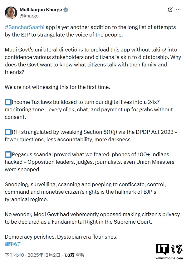 此項強制安裝令此前引發強烈爭議。反對黨國大黨領袖馬利卡瓊・卡爾格(Mallikarjun Kharge)周二在 X 平臺上發文稱,此舉將導致“窺探、監視、掃描和偷窺”,并形容其“近乎獨裁”。
