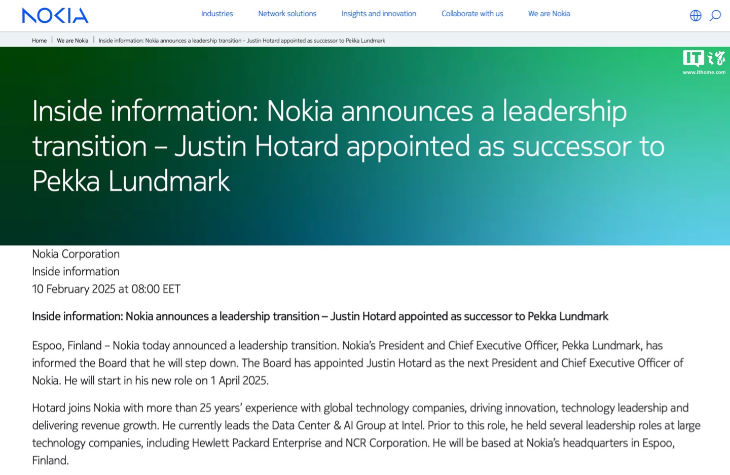 霍塔德目前負責英特爾數據中心和人工智能業務,他將“憑借超過 25 年的國際科技公司經驗”,領導諾基亞公司繼續前行。