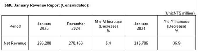 臺積電今日披露 1 月營收報告顯示,1 月臺積電合并營收約為 2932.88 億元新臺幣(IT之家備注:當前約 651.54 億元人民幣),環比增長 5.4%,同比增長 35.9%。