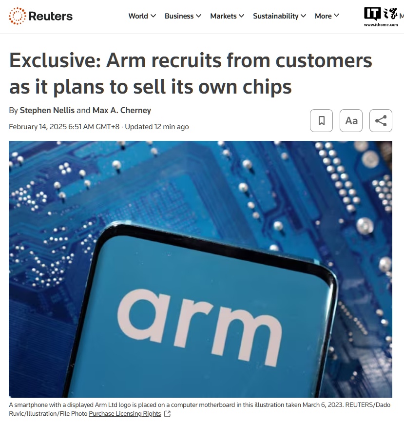 2 月 14 日消息,據路透社援引知情人士及文件消息稱,Arm 正加快向芯片業務擴展的步伐,不僅從客戶公司挖掘人才,還在市場上直接與客戶展開競爭,爭取芯片訂單。