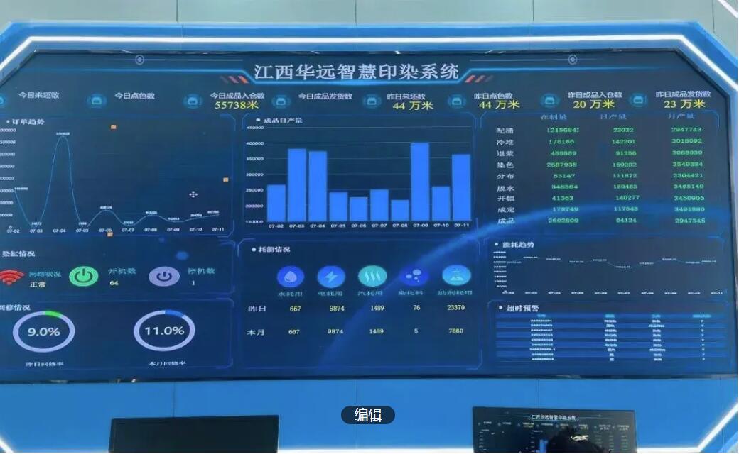 作為一家總投資15.5億元、每年可生產8000萬噸精品面料的新型紡織面料加工企業,華遠針織從建設初期就堅持走“信息化”與“工業化”深度融合之路。依托江西聯通的技術支持,華遠針織成功打造印染行業“5G數字工廠”,將物聯網、大數據、人工智能等新一代信息技術應用于生產制造全過程。通過搭建印染MES工業互聯網平臺,企業實現了設備運行狀態、染助劑投放、生產作業進度等關鍵環節的可視化,并對投入產出、設備效率、能源使用等業務指標通過量化分析,進行預測預警。此外,華遠針織還成立了車間智慧控制中心,全面提升生產管控和綠色節能水平,不僅提升產品品質,提高了染色合格率,還顯著降低了物料成本和能耗使用。