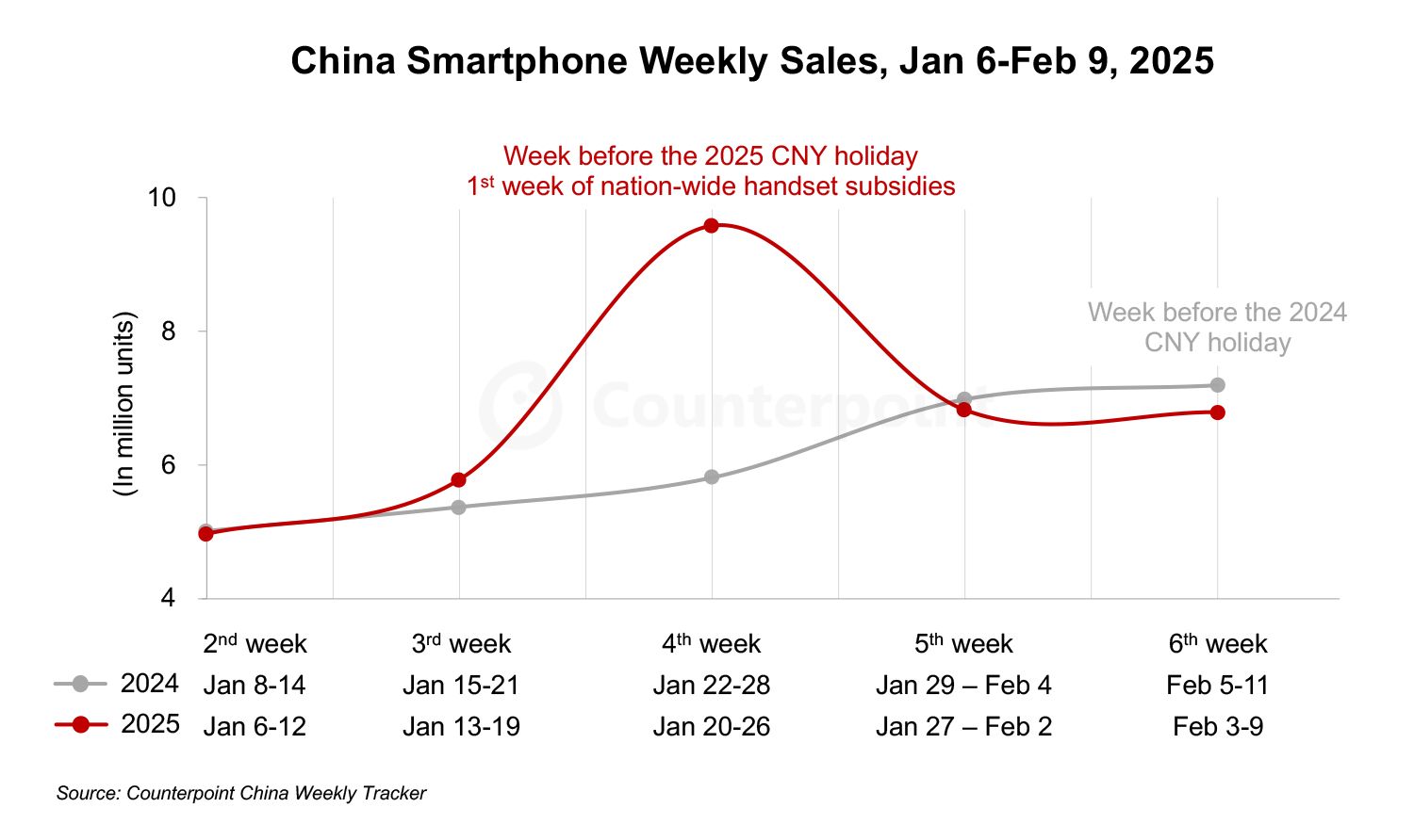 Counterpoint 預計,這項補貼政策將推動 2025 年第 1 季度中國智能手機銷量同比增長 2 至 3 個百分點。