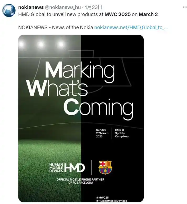 2月26日消息,諾基亞新聞公布了HMD Global將在3月2日,在MWC 2025(世界移動通信大會)上推出新產品,以及公布了HMD Global與巴塞羅那足球俱樂部合作,Human Mobile Devices (HMD) 成為巴塞羅那足球俱樂部的全球合作伙伴。