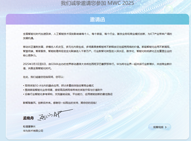 華為,作為一家通信行業的龍頭企業,每年MWC期間華為的展臺面積,展品的豐富程度都是首屈一指,華為的技術創新也是通信行業尤其值得關注的重點。近日,華為輪值董事長孟晚舟也發出邀請函。她寫道:“移動AI正蓬勃發展,多模態人機交互、多元化內容生成、多場景具身智能將不斷釋放泛在超寬網絡的價值。家庭智能化應用不斷涌現,智慧終端、智家服務、智能助理將促進全光聯接進入千家萬戶。行業數智化轉型進入深水區,數字化、智能化和低碳化正在重塑企業的核心競爭力。”