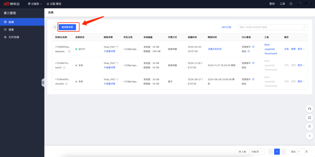 以 DeepSeek R1 版本為例,具體的使用步驟如下:1、進入算力管理頁面,點擊租用新實例按鈕
