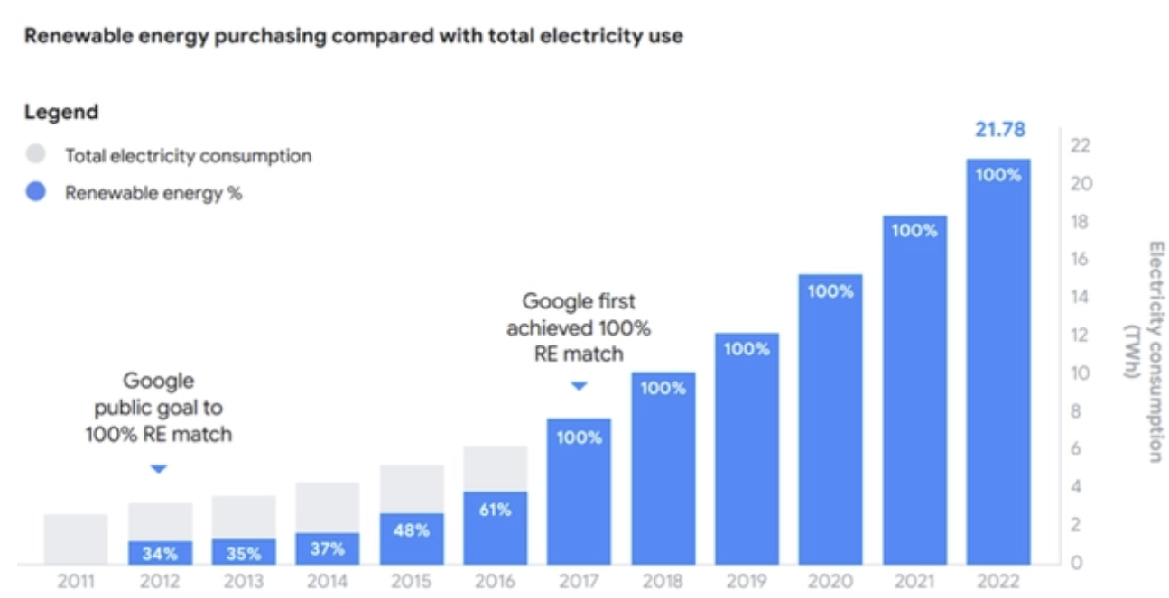 圖1 谷歌可再生能源采購量與總用電量的比較