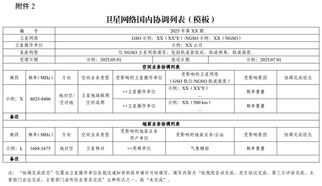 第九條工業和信息化部通過建立國內協調列表(模板見附件2)確立申報的衛星網絡與協調地位較高的衛星網絡以及相關地面無線電臺(站)之間的協調關系。申報單位應依據國內協調列表確立的協調關系開展頻率協調工作。