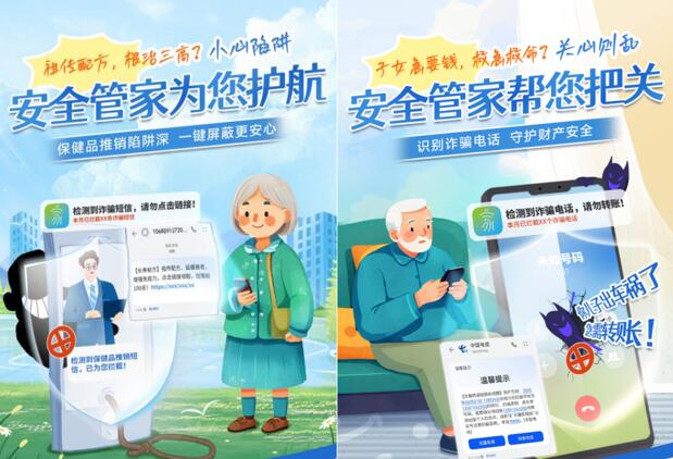 數據顯示,超過三成的老年人遭遇過網絡詐騙、保健品詐騙等騙局,其面臨的網絡安全問題不容忽視。天翼數字生活公司“安全管家”針對用戶防欺詐需求,提供釣魚欺詐等惡意網址智能告警及通話防欺詐功能,營造清朗的網絡環境,避免用戶掉入“詐騙陷阱”。