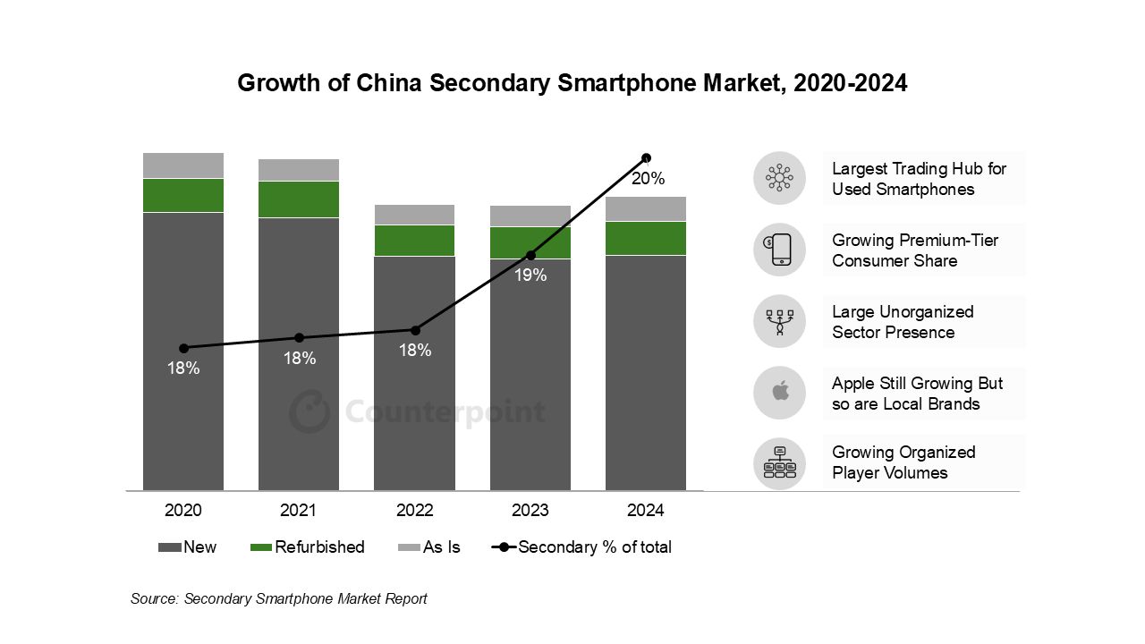 3 月 25 日消息,中國作為全球最大的二手智能手機市場,其行業動態備受關注。市場調查機構 CounterPoint Research 昨日(3 月 24 日)發布博文,報告稱 2024 年中國二手智能手機市場(包括翻新和二手手機)已占全國智能手機總銷量的 20%。