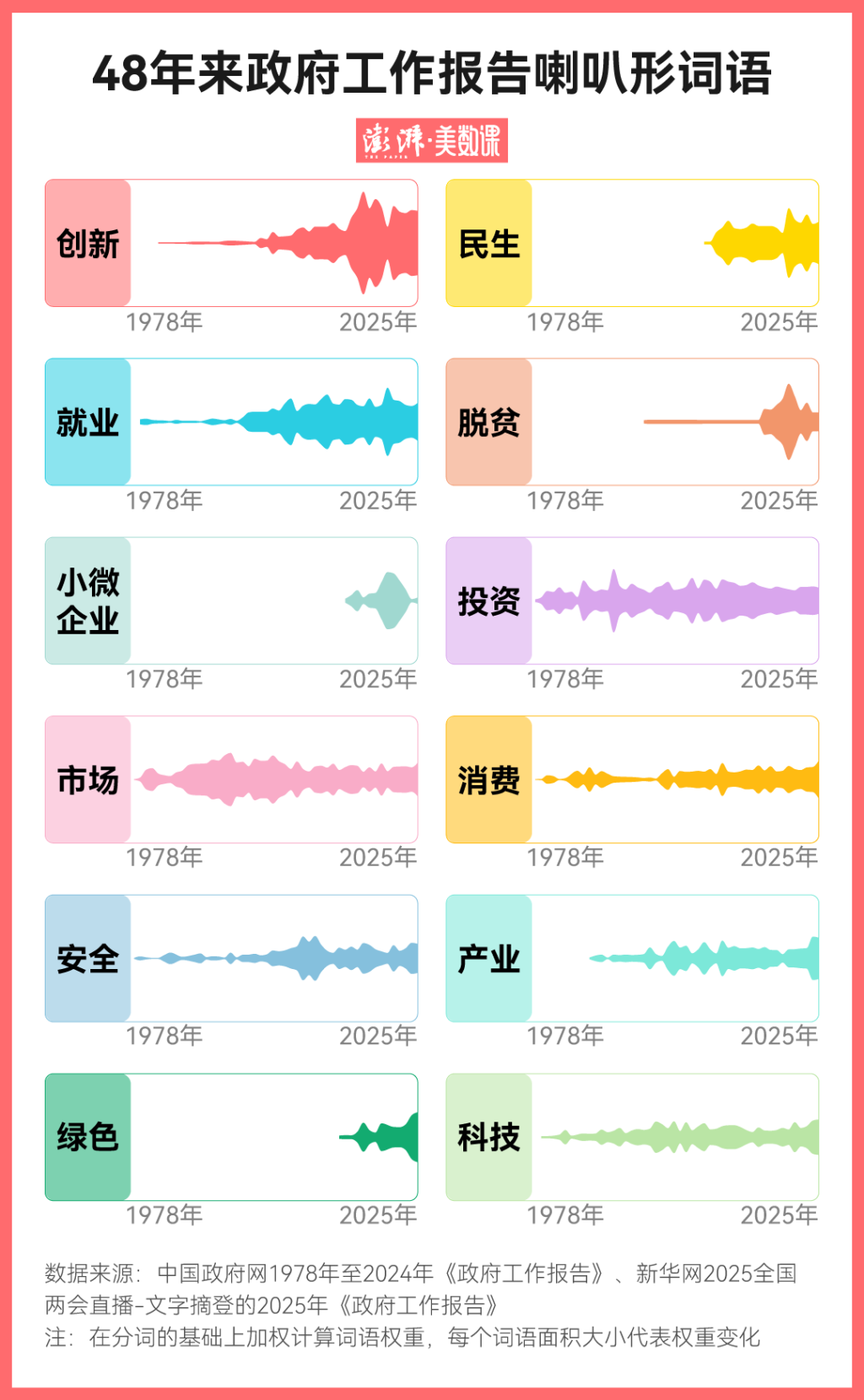 還有部分詞語愈發頻繁地出現在《政府工作報告》中,比如“創新”“民生”“就業”。因其增長趨勢,澎湃新聞將此類詞語稱為“喇叭形詞語”。