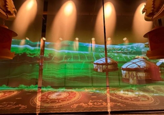 《昭君出塞》紗幕投影(左);三樓劇場四面舞臺上的沉浸式視覺效果(右)。
