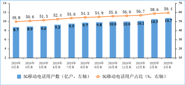 5G網(wǎng)絡(luò)服務(wù)能力持續(xù)升級(jí)。截至2025年3月末,5G基站總數(shù)達(dá)439.5萬個(gè),比上年末凈增14.5萬個(gè),占移動(dòng)基站總數(shù)的34.4%,占比較上年末提高0.8個(gè)百分點(diǎn)。