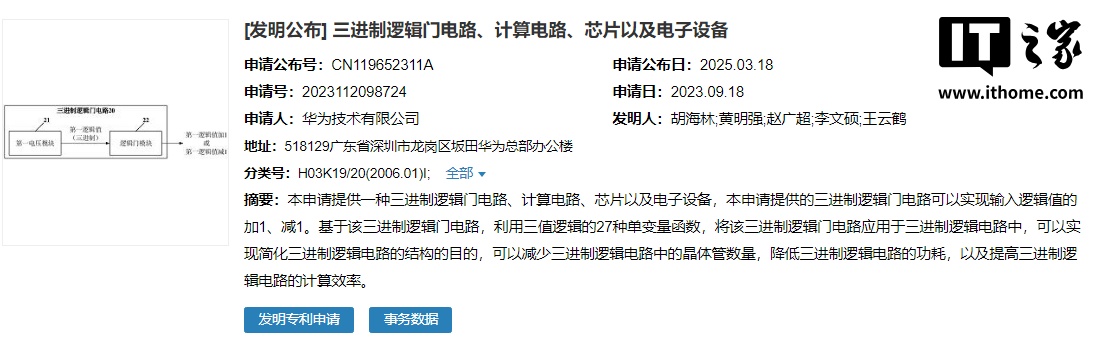 4 月 7 日消息,國家知識產權局信息顯示,華為技術有限公司 3 月 18 日公布了一項名為“三進制邏輯門電路、計算電路、芯片以及電子設備”的專利,公開號為 CN119652311A,申請日期為 2023 年 9 月 18 日。