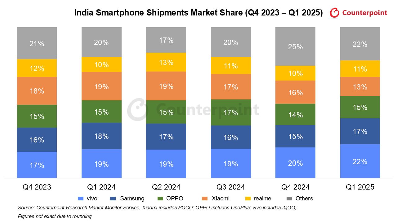 CounterPoint 報告 2025Q1 印度手機出貨量:vivo 22% 連續 3 個季度領跑