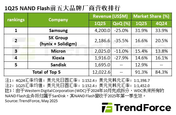 今年第一季度,五大 NAND 閃存原廠的營收前兩名維持三星和 SK 集團不變,美光則反超鎧俠首度來到本季度榜單的第三名,而各大原廠中 NAND 營收降幅以 SK 集團最為嚴重。