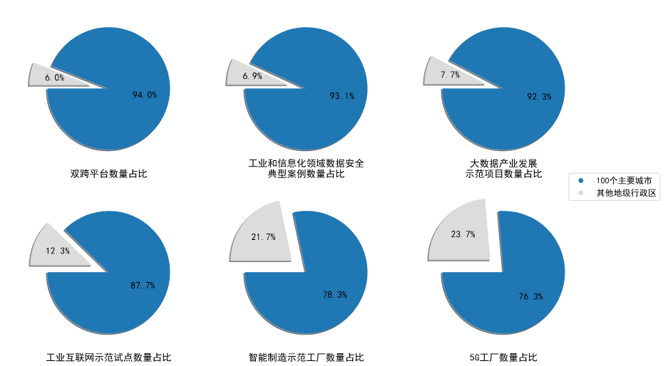 從產(chǎn)業(yè)發(fā)展特征來看,在工信部發(fā)布的 2023 年相關名單來看,在全國 333 個地級行政區(qū)劃中,100個工業(yè)互聯(lián)網(wǎng)主要城市擁有全國 94%的雙跨平臺,92.3%的大數(shù)據(jù)產(chǎn)業(yè)發(fā)展示范項目,93.1%的工業(yè)和信息化領域數(shù)據(jù)安全典型案例,78.3%的智能制造示范工廠,76.3%的 5G 工廠,工業(yè)互聯(lián)網(wǎng)產(chǎn)業(yè)發(fā)展及應用水平較高。