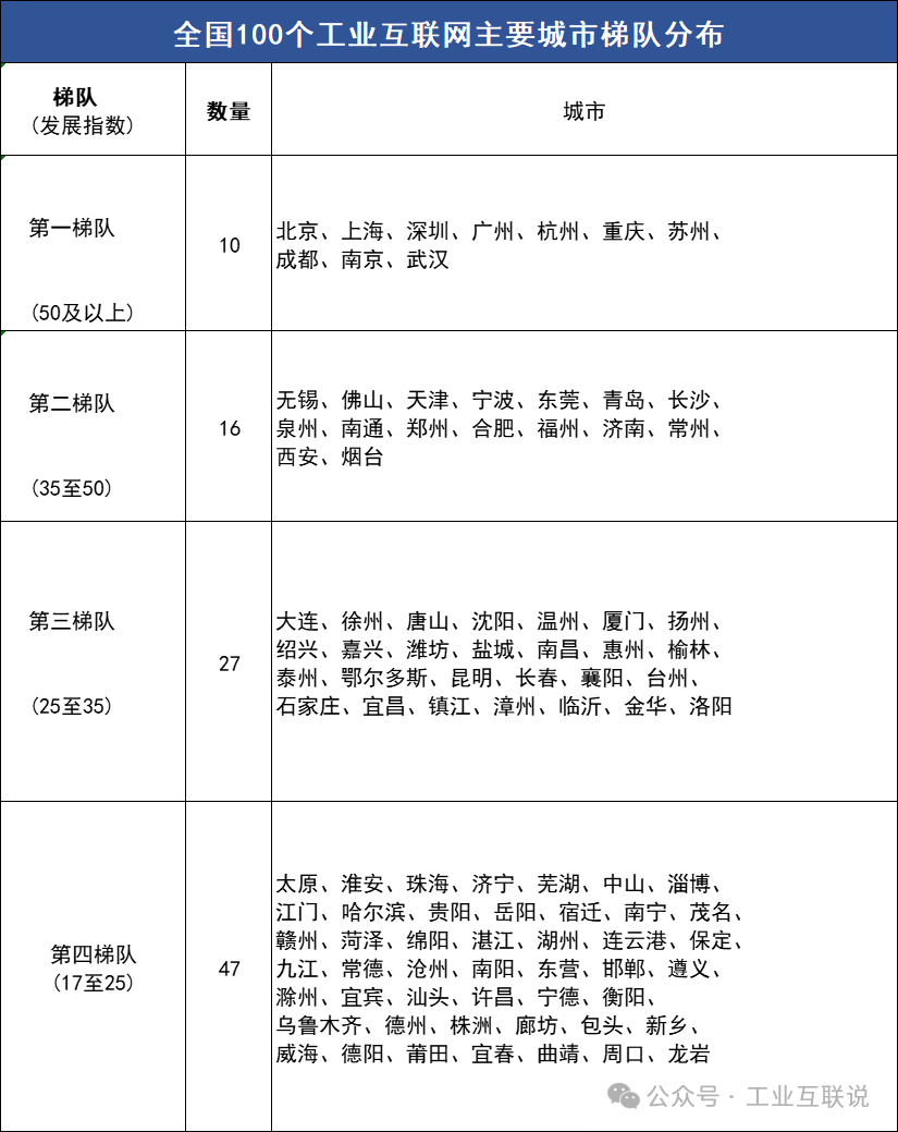 圖:全國100個工業(yè)互聯(lián)網(wǎng)主要城市梯隊分布
