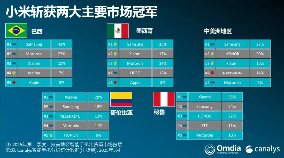 Canalys:2025 年 Q1 拉美智能手機市場出貨量同比下降 4%,三星、小米、摩托羅拉前三