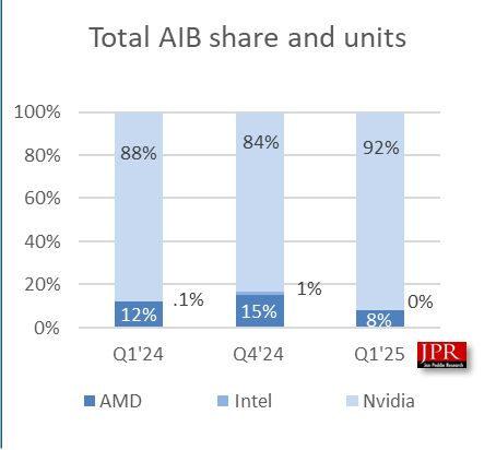 JPR 報告 2025Q1 全球 PC 附加板 AIB 顯卡出貨量:英偉達 92% 一騎絕塵,AMD、英特爾難以望其項背