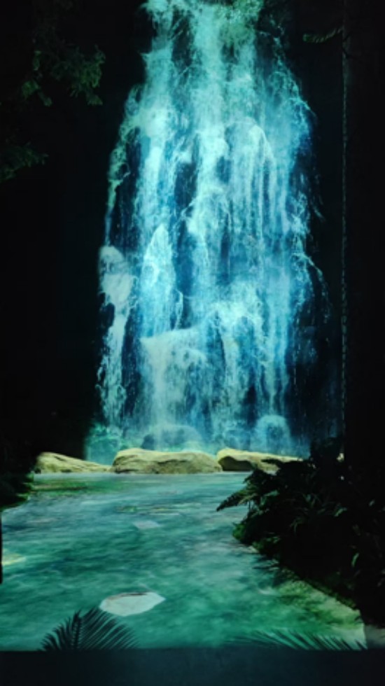 另一個亮點是瀑布投影體驗區(qū),水主題的投影覆蓋了巨大的屏幕和地面。游客行經(jīng)該區(qū)域時,會觸發(fā)數(shù)字水花與植物搖曳的動態(tài)效果。這一視覺幻象由四臺經(jīng)過精密布署的科視Christie DWU880-GS投影機(jī),通過視覺渲染與響應(yīng)式交互技術(shù)的無縫融合所實現(xiàn)。