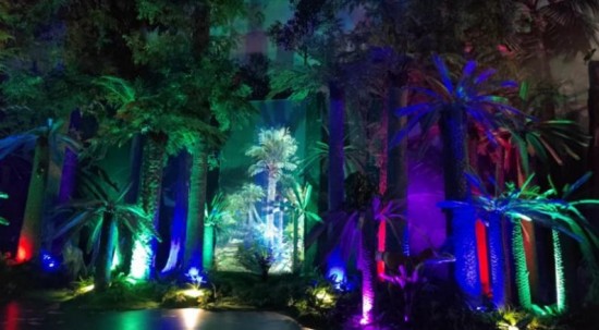 白堊紀(jì)恐龍投影區(qū)通過六臺DWU880-GS投影機(jī)構(gòu)建全景動態(tài)場景,在茂密的史前叢林中展示各類恐龍的生動行為。與之相鄰的半透明紗幕投影區(qū),光影在浮動紗幕上交織出空靈氛圍,恍若遠(yuǎn)古景觀在眼前具象化。這一迷人奇觀由一臺吊架安裝的DWU880-GS投影機(jī)實現(xiàn)。