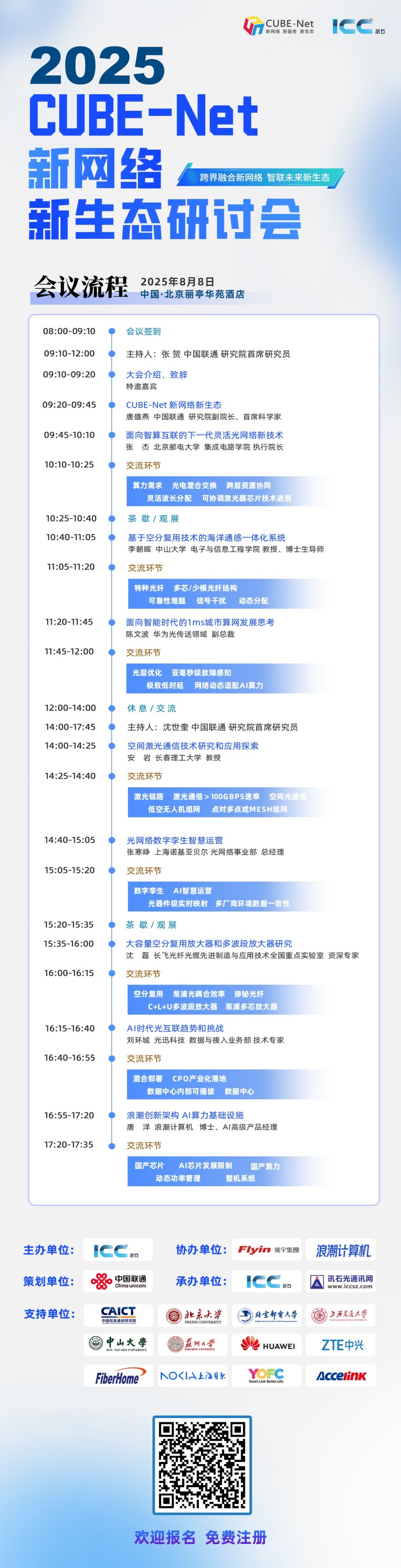 8月8日 由中國聯通策劃的CUBE-Net 2025將在北京麗亭華苑酒店舉辦,出席本次CUBE-Net 2025研討會的光電、傳感、通信領域的行業同仁將能夠直觀了解光網絡最新技術進展和運營商最新網絡需求。
