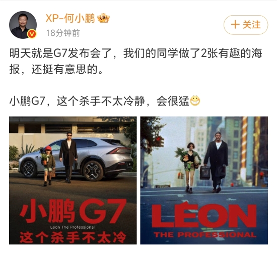 他表示,“我們把「既要又要」的產(chǎn)品理念放在了25萬的小鵬G7身上,讓更多人在體驗科技樂趣的同時,也能滿足家人的幸福體驗,希望大家喜歡。”同時,他還曬出模仿電影《這個殺手不太冷》拍攝的海報,海報下沿標注“7月3日北京上映”,預(yù)示著可能會在G7發(fā)布會上播出。何小鵬配文,“小鵬G7,這個殺手不太冷靜,會很猛”。