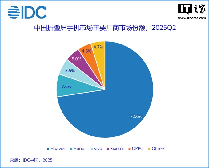 IDC:2025 年 Q2 中國折疊屏手機(jī)市場出貨量同比下降 14%,華為獨(dú)占超七成份額